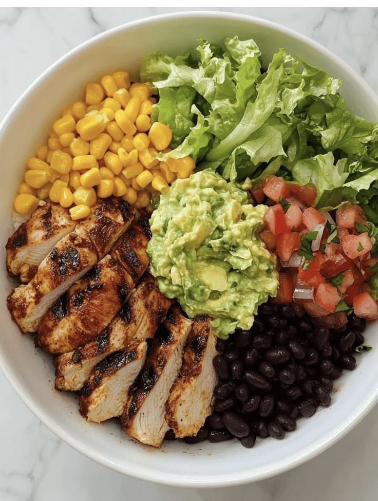 A vibrant and nutrient-packed salad featuring tender grilled chicken breast, creamy avocado, juicy tomatoes, crisp sweet corn, hearty salad beans, and fresh crunchy lettuce. Tossed in a light olive oil-lemon dressing, this salad is a delicious blend of flavors and textures that refresh and energize.