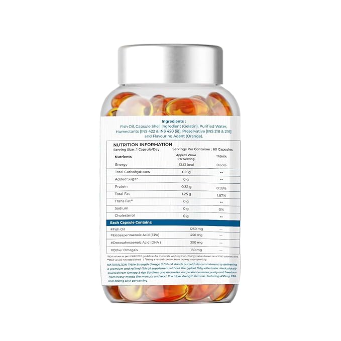 NATURALTEIN Omega-3 Fish Oil 1250mg – Triple Strength Softgels | 450mg EPA & 300mg DHA | Pack of 60 | Premium Triglyceride Form | Glyphosate-Free | Heart, Brain & Joint Support