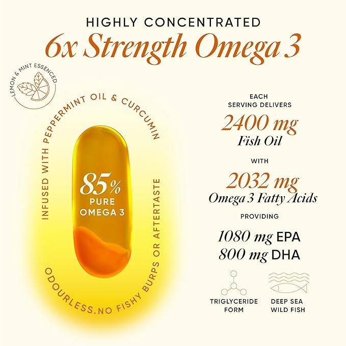 - HIGHLY CONCENTRATED 6X OMEGA 3 Wellbeing Nutrition's Omega-3 Fish Oil supplement delivers 6x strength, providing 2400 mg of fish oil with 1080 mg EPA and 800 mg DHA per serving. Each serving consists of 2 softgels delivering 2032 mg total omega 3 fatty acids (85% pure Omega-3) sustainably sourced from wild-caught deep sea fish, ultrapurified for a mercury free pure fish oil.