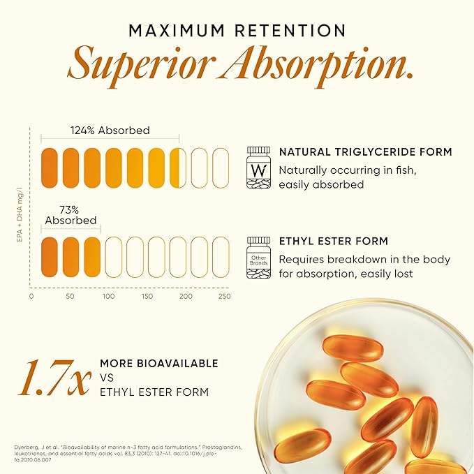 - 1.7x POTENT TRIGLYCERIDE FORM For maximum retention and superior absorption, our Omega-3 supplement is formulated in the natural triglyceride form, which is 128% absorbed by the body, making it more effective and bioavailable. Since triglycerides naturally occur in fish, they are easily absorbed, providing enhanced benefits without unnecessary loss during digestion. Unlike the ethyl ester form, which requires breakdown in the body and has a lower absorption rate of 73%, the natural triglyceride form is 1.7x more bioavailable, ensuring better retention and utilization.